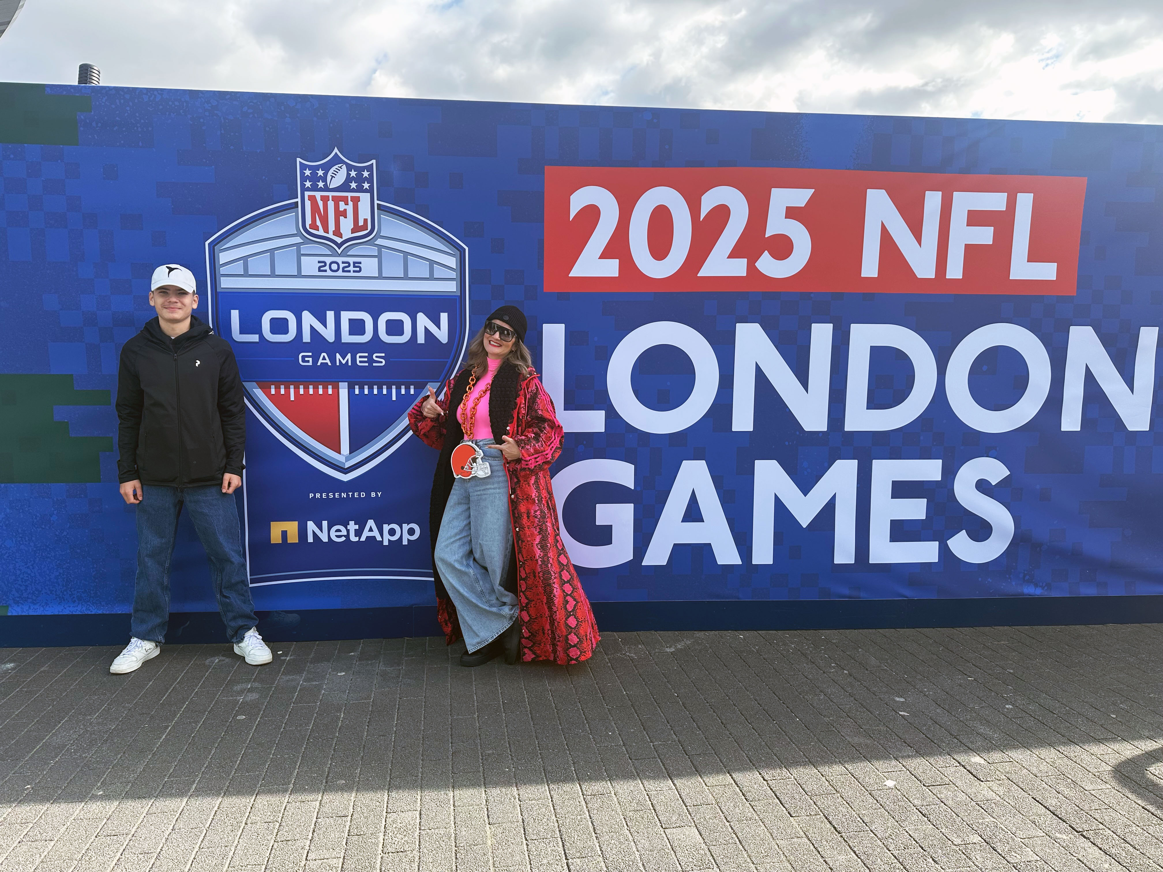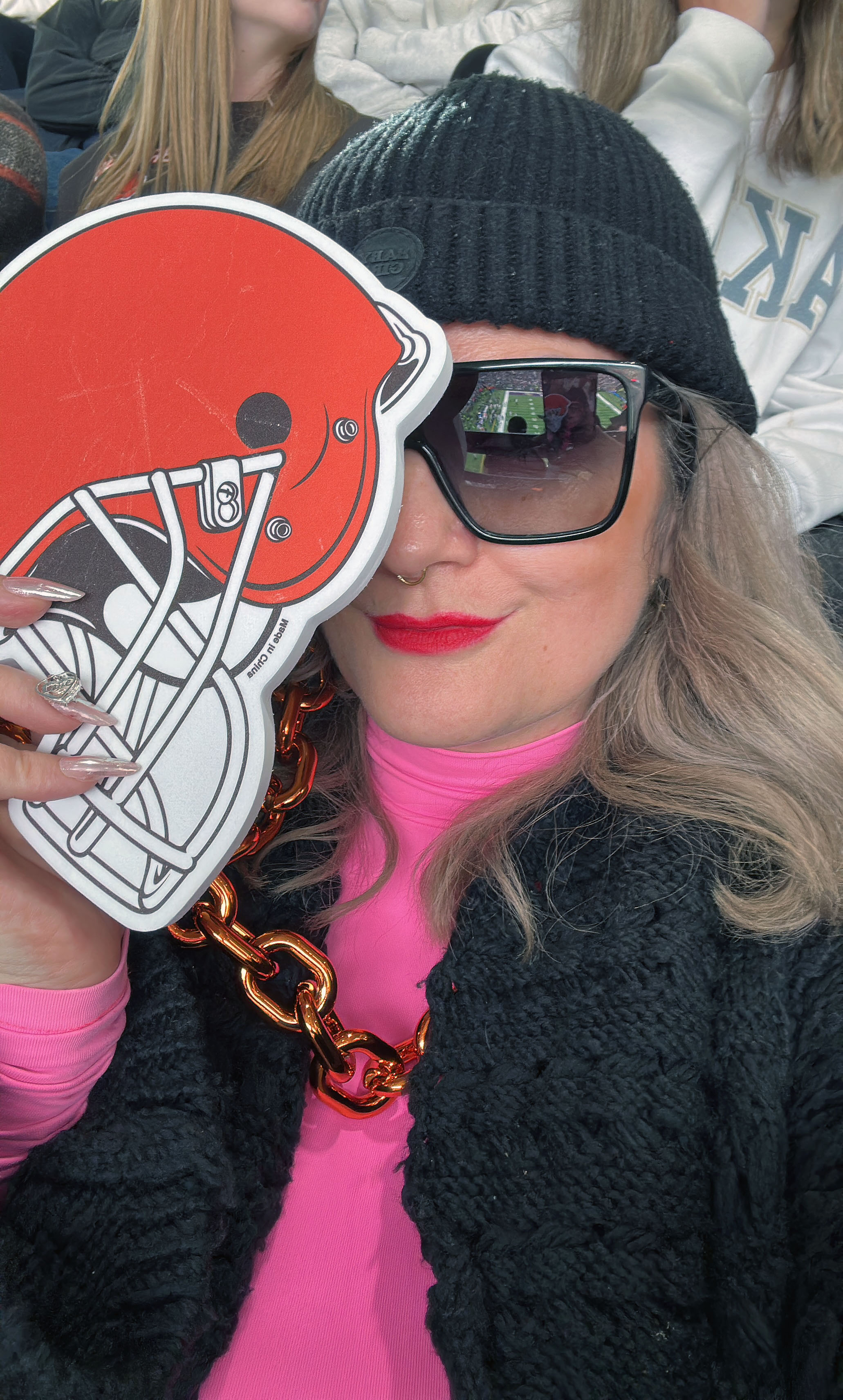 Ich war eigentlich Fan der Minnesota Vikings, wie mein Sohn – aber ihre monströsen Fan-Ketten die ich unbedingt wollte, waren ausverkauft. Also griff ich kurzerhand zu einer der Cleveland Browns. Sie passte ohnehin besser zu meinem Outfit – und, Hand aufs Herz, die hübscheren Spieler hatten eindeutig die Browns.
